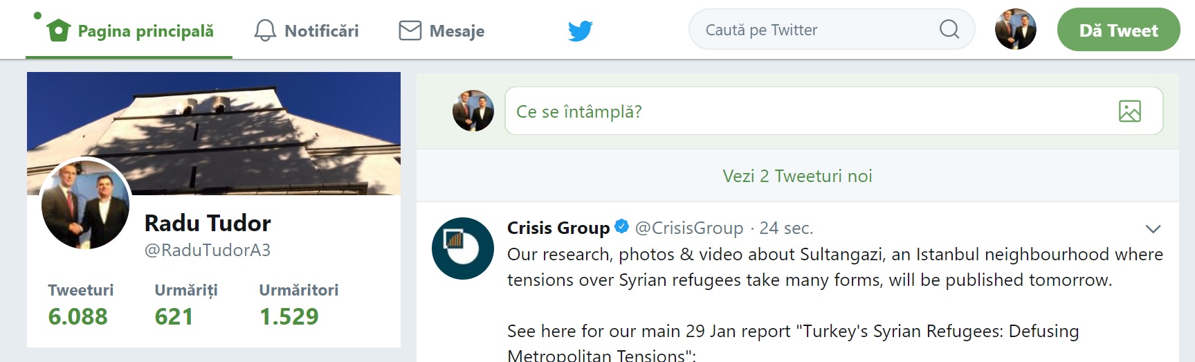 Recent si pagina de Twitter @RaduTudorA3 a depasit 1500 followers.