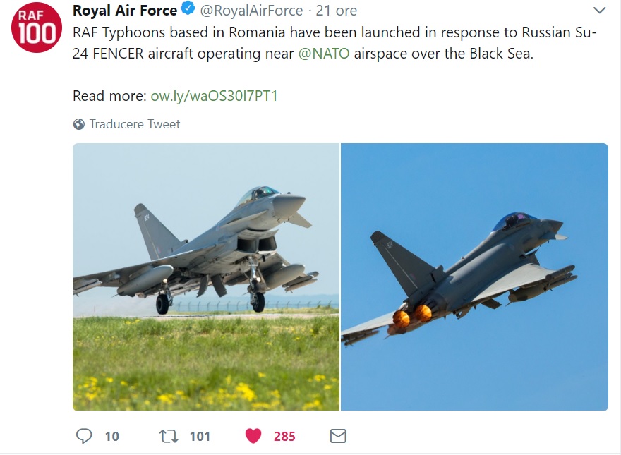 Royal Air Force Typhoons based in Romania have been launched in response to Russian Su-24 FENCER aircraft operating near NATO airspace over the Black Sea.
