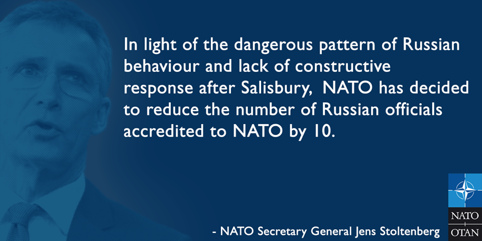 In urma atacului pe teritoriul NATO, Secretarul General al Aliantei, Jens Stoltenberg, a anuntat ca retrage acreditarea pentru 7 oficiali rusi din Misiunea Rusiei la NATO. Altor 3 oficiali rusi li se va refuza acreditarea ceruta deja.