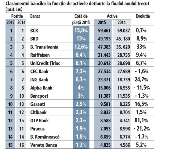 Podiumul bancar local a înregistrat în 2016 o schimbare istorică, Banca Transilvania depăşind BRD-SocGen în topul celor mai mari bănci de pe piaţa locală după active şi urcând pe locul doi, o poziţie care a fost ocupată tradiţional până în 2015 de instituţia de credit cu capital francez. La nivel agregat, sistemul bancar avea anul trecut active totale nete de aproape 394 mld. lei.