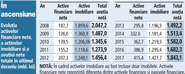Avuţia netă a populaţiei s-a majorat cu 10% în 2017 faţă de anul anterior. Activele financiare nete ale populaţiei s-au majorat anul trecut cu aproximativ 7%, până la 415,4 mld. lei, iar activele imobiliare au făcut un salt de 10%, până la 1.427,7 mld. lei, reiese din datele BNR.
