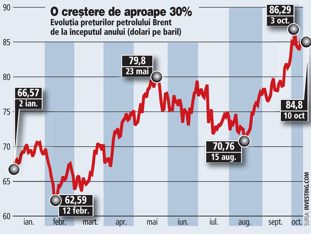 Preţul petrolului Brent, referinţa pentru piaţa internaţională, a crescut peste aşteptări anul acesta, atingând niveluri pe care unii analişti le consideră cote de pericol: creşterea cotaţiilor ţiţeiului face energia mai scumpă şi frânează astfel consumul şi economia. Ieri, petrolul se tranzacţiona cu aproape 85 de dolari pe baril. Unii analişti se aşteaptă ca preţul să urce până la 100 de dolari pe baril. Avertismentele se înteţesc.