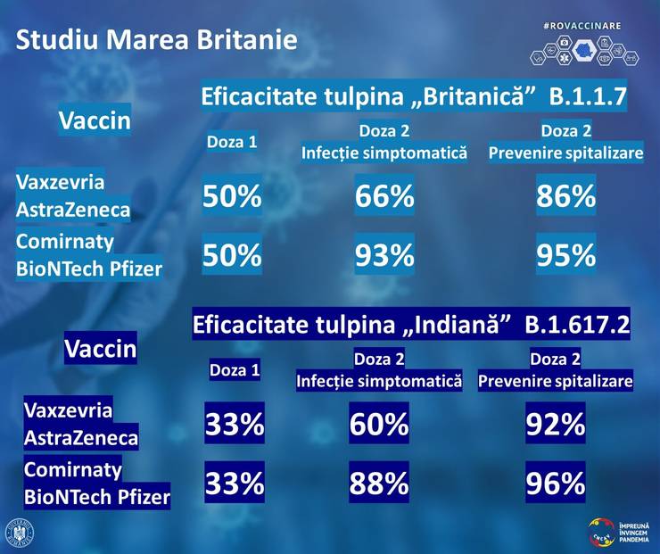 •Eficacitatea împotriva cazurilor de COVID-19 simptomatic, după administrarea regimului complet, este similară între tulpini, pe tulpina “Indiană” B.1.617.2 fiind ușor mai scăzută;