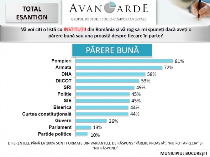 Cea mai bună părere bucureştenii o au, în ordine, despre Pompieri, Armată şi DNA. La polul opus se află Guvernul, Parlamentul şi partidele politice.