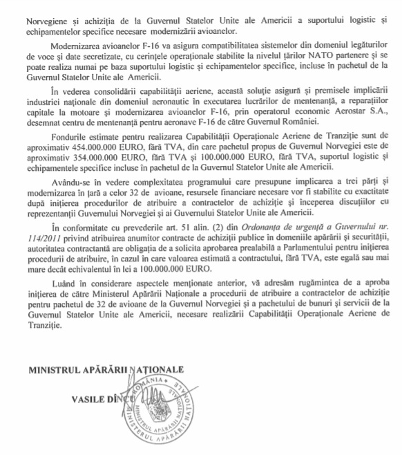 România va cumpăra avioane de vânătoare F-16 din Norvegia, pentru 354 de milioane de euro, dar şi suport logistic şi echipamente specifice în valoare de 100 de milioane de euro din SUA.
