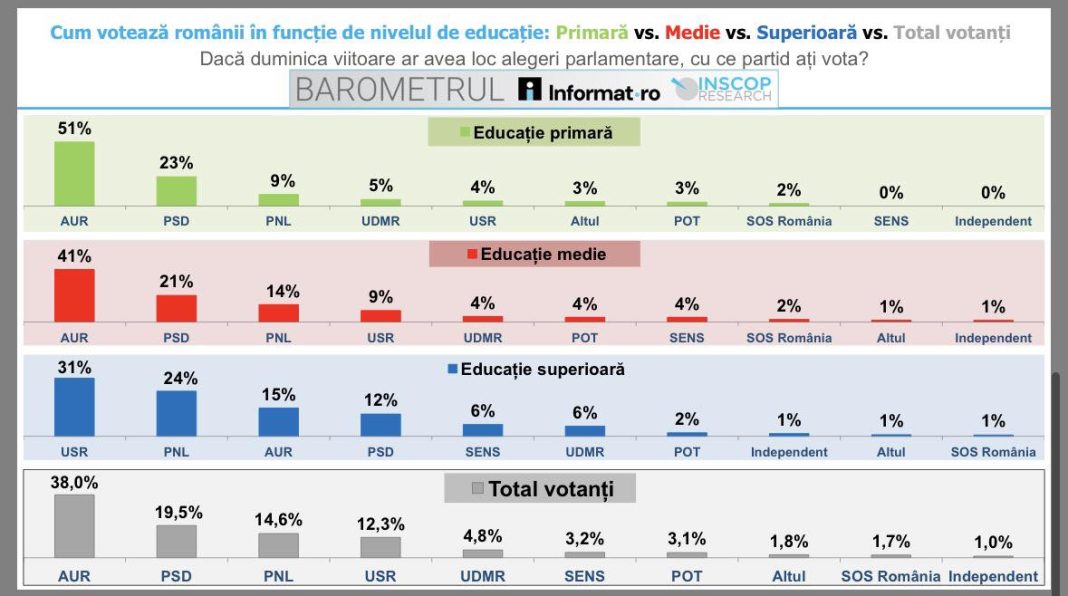 51% dintre persoanele cu educație primară și 41% dintre cei cu educație medie ar vota cu AUR, în timp ce prima poziție în topul intenției de vot al persoanelor cu educație superioară ar fi ocupată de USR, cu 31%.