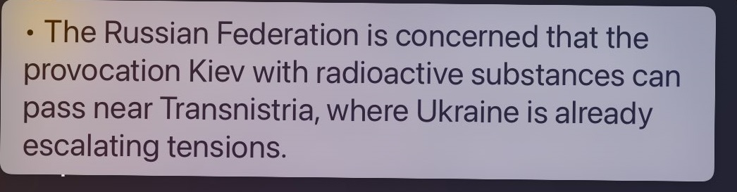 Traducerea : “Ministerul rus de Externe este îngrijorat că Ucraina ar putea folosi materiale radioactive aduse de la Odesa pentru a organiza o provocare în jurul Transnistriei, acolo unde Ucraina deja escaladeaza tensiunile”