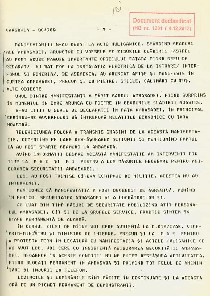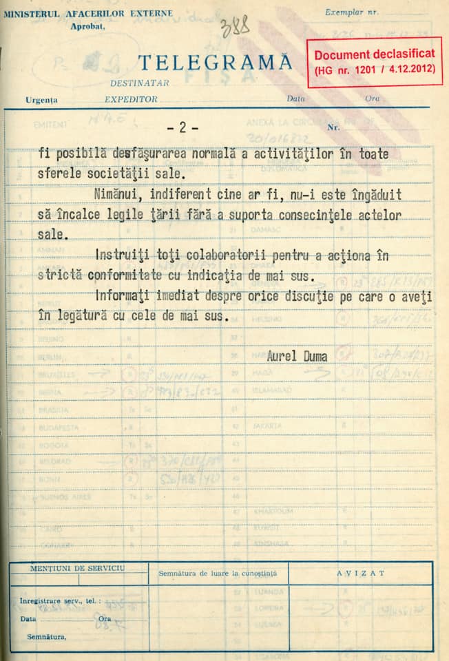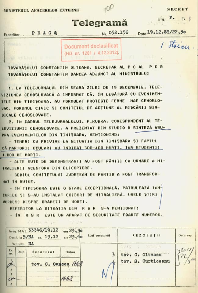 Tocmai în acest scop, având în vedere importanța respectării adevărului istoric, am solicitat încă din mandatul precedent de ministru de externe, iar Ministerul Afacerilor Externe a desecretizat documentele de arhivă referitoare la Revoluția română din decembrie 1989, documente care reflectă modul în care regimul comunist se raporta la evoluțiile înregistrate în țările vecine începând din primăvara anului 1989, reacțiile internaționale față de evoluțiile din România, precum și tentativele de a combate izolarea politico-diplomatică internațională din acea perioadă. Materialele din Arhivele Diplomatice ale MAE ilustrează percepția în plan internațional asupra evenimentelor revoluționare din decembrie 1989 din România, precum și schimbarea de regim și tranziția spre o societate democratică, pe model european.