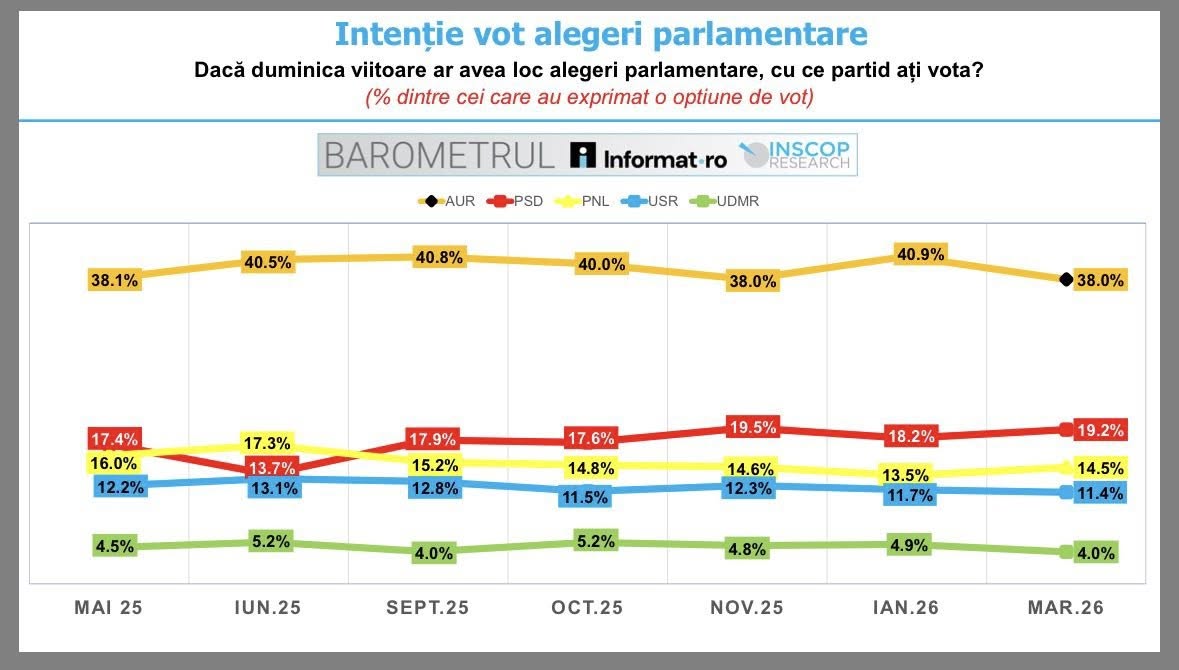 Iar PSD, PNL și USR abia ating împreună, cumulat, foarte puțin peste scorul AUR.