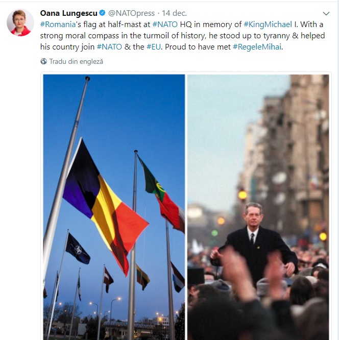Purtatorul de cuvant al NATO, Oana Lungescu, posteaza pe Twitter un mesaj si o fotografie impresionanta : drapelul Romaniei coborat in berna la Cartierul General al NATO din Bruxelles, la moartea Majestatii Sale Regele Mihai.