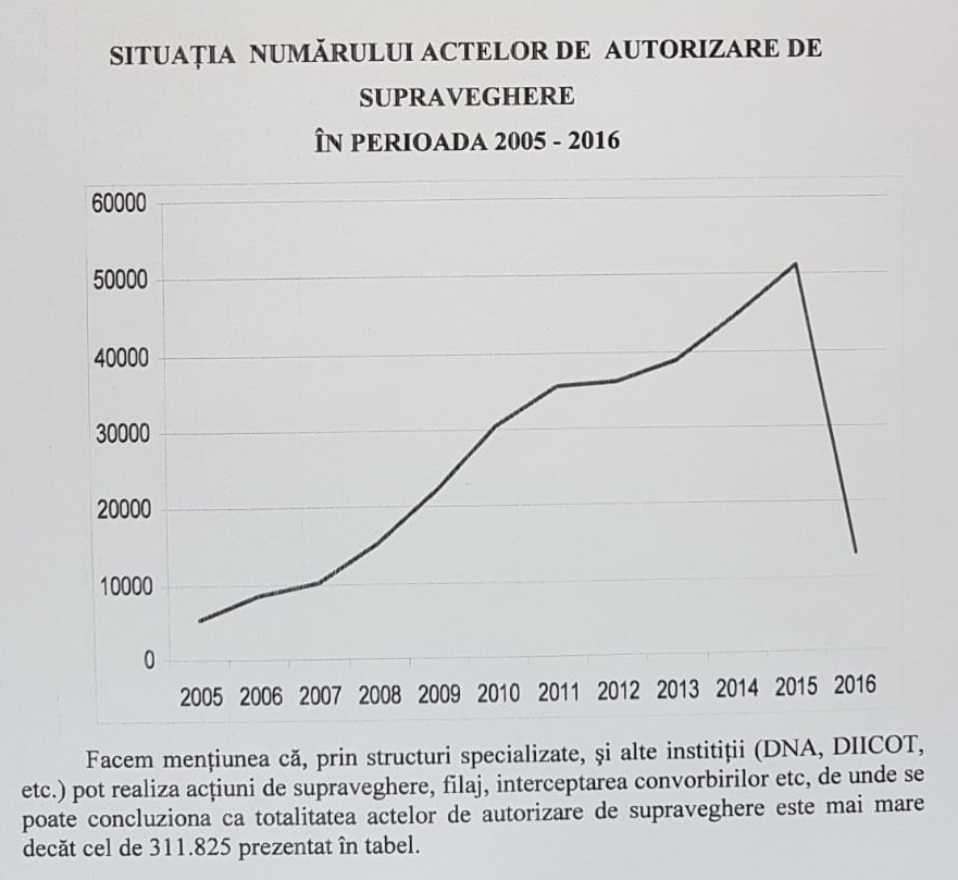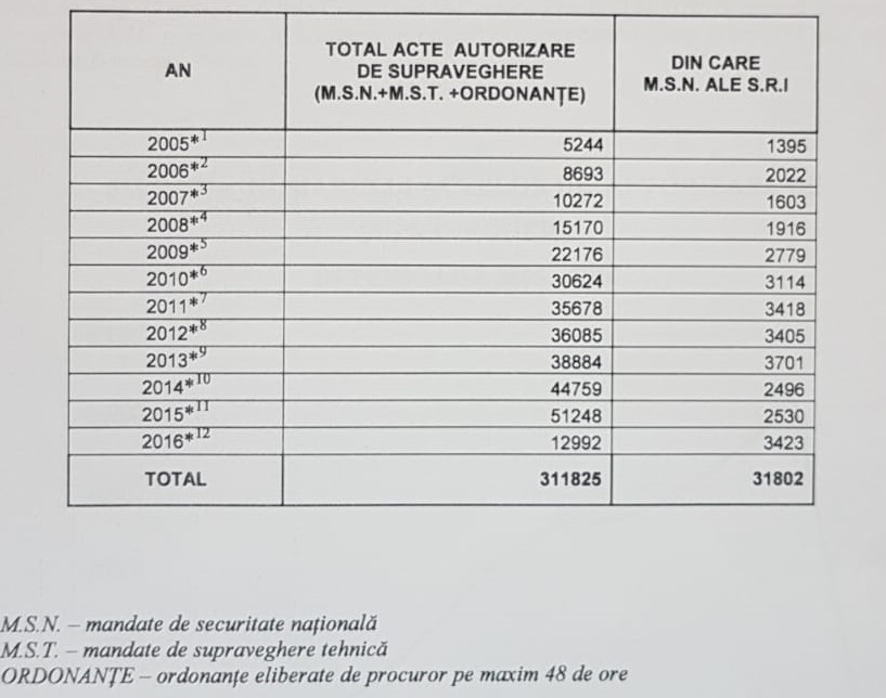La finalul lunii mai, preşedintele Comisiei de control SRI, senatorul PSD Claudiu Manda, anunţa că în perioada 2005-2016 mai mult de şase milioane de români au fost interceptaţi de SRI, dar şi că a fost sesizat că în 2012 aproape tot Guvernul şi peste 100 de parlamentari au fost interceptaţi. Ulterior, SRI a venit cu precizări. Potrivit Servicului, între 2004 – 2016 au fost solicitate 28.784 mandate de securitate naţională, dintre care puţin peste 9.200 au fost mandate iniţiale, iar numărul de persoane ale căror drepturi şi libertăţi au fost restrânse în baza autorizaţiei a fost de 20.907.