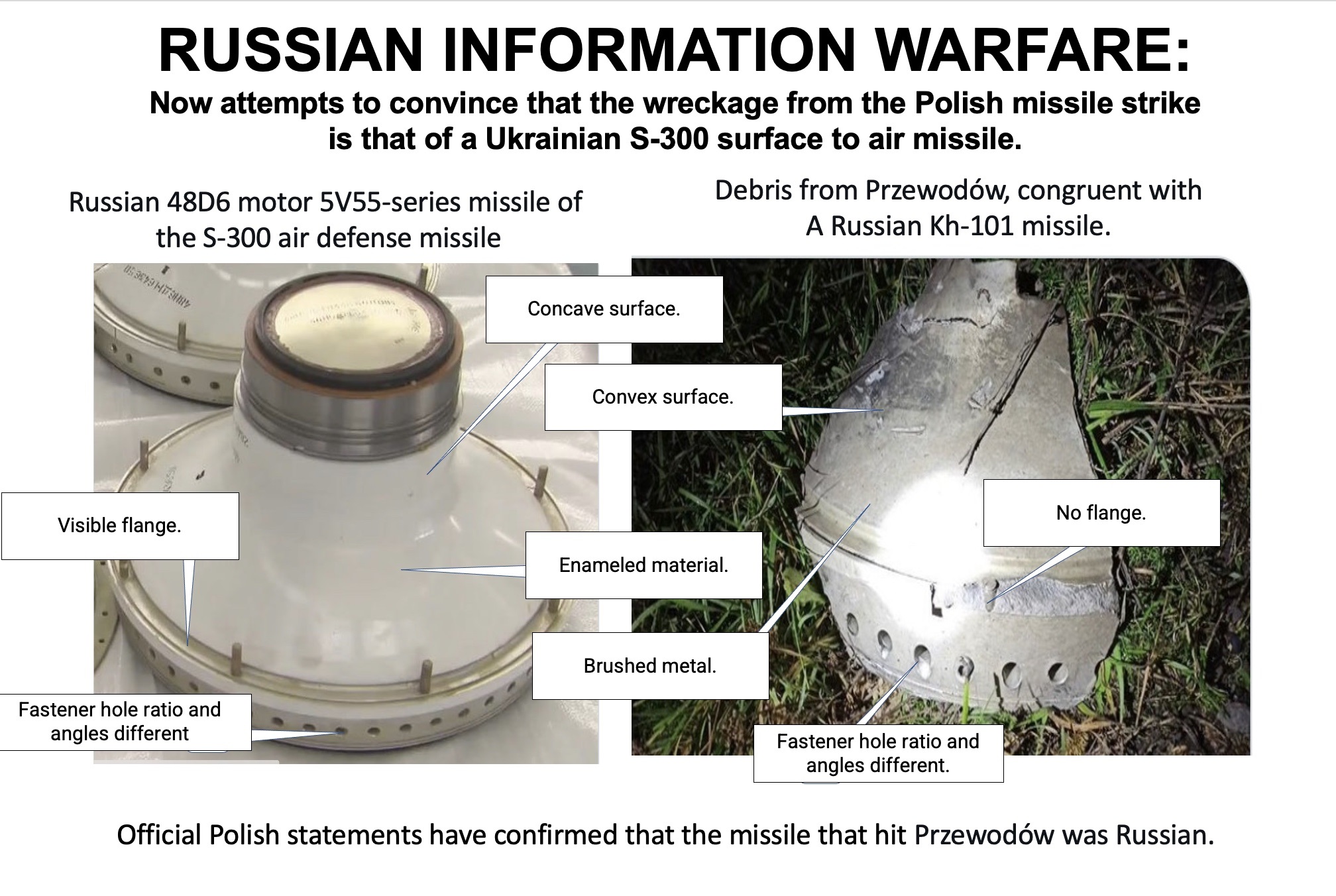Unul din cei mai buni analisti militari ai razboiului, americanul Chuck Pfarrer, fost comandant Navy Seals, argumenteaza ca racheta cazuta este una ruseasca, un Kh-101 din cele utilizate de Rusia ieri pentru bombardarea Ucrainei :