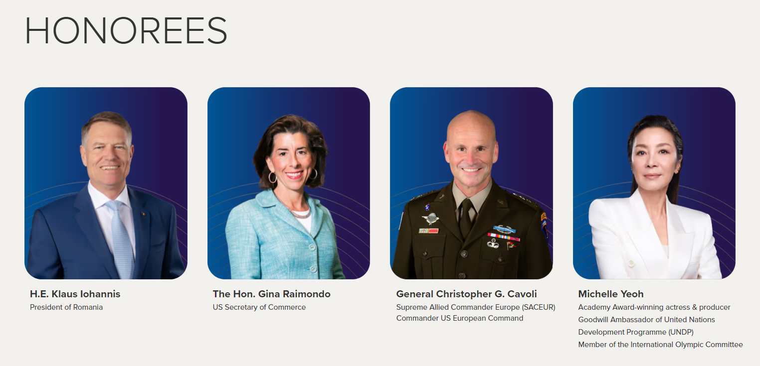 Alături de Preşedintele României, alte 3 personalităţi americane vor fi premiate. Este vorba despre Generalul Christopher Cavoli, Comandatul Suprem al Forţelor Aliate din Europa (SACEUR), Gina Raimondo, Secretarului Comerţului din SUA şi Michelle Yeoh, Ambasador al Bunăvoinţei pentru ONU.