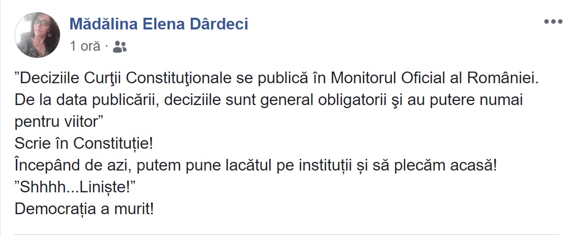 ”Deciziile Curţii Constituţionale se publică în Monitorul Oficial al României. De la data publicării, deciziile sunt general obligatorii şi au putere numai pentru viitor. Scrie în Constituţie! Începând de azi, putem pune lacătul pe instituţii şi să plecăm acasă! Shhhh… Linişte! Democraţia a murit!”, a scris pe Facebook Mădălina Elena Dârdeci, preşedintele Secţiei a VI-a Civilă, de la Tribunalul Bucureşti.