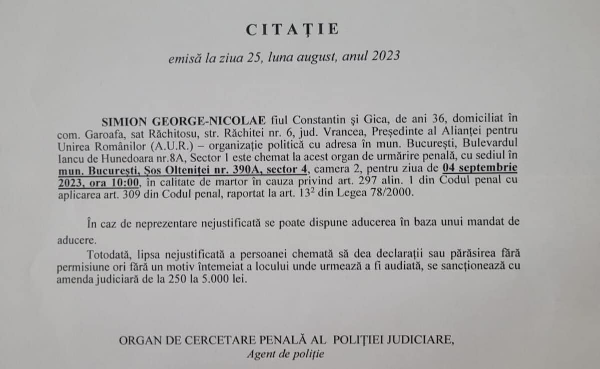 Articole Less than 1 min.Read Liderul AUR George Simion, chemat la DGA ! By Radu Tudor September 1, 2023 FacebookTwitterPinterestLinkedin Liderul AUR George Simion : Am primit această citație de la DGA. Nu pot să nu observ cum foarte multe instituții au fost mobilizate în ultimele zile ca să încerce să ne blocheze. Hot this week Articole Regele Charles în Congresul SUA : Întăriți NATO și fiți alături de Ucraina April 29, 2026 0 Într-un rar discurs adresat Congresului SUA, marți, regele Charles... Articole Antena3.ro : un istoric britanic luptă pentru limba română în Marea Britanie April 27, 2026 0 Tessa Dunlop e istoricul și jurnalista britanică a cărei... Articole Cine sunt cei mai mari producători de armament ai momentului April 24, 2026 0 Cine sunt cei mai mari producători de armament ai... Articole Compuși organici noi descoperiți pe Marte April 24, 2026 0 Lista compușilor organici detectați pe Marte a fost completată... Articole UE recunoaște greșeala : nu vă grăbiți să închideți centralele nucleare April 24, 2026 0 Comisia Europeană urmează să publice un pachet de măsuri... Topics Articole Regele Charles în Congresul SUA : Întăriți NATO și fiți alături de Ucraina 0 Într-un rar discurs adresat Congresului SUA, marți, regele Charles... Articole Antena3.ro : un istoric britanic luptă pentru limba română în Marea Britanie 0 Tessa Dunlop e istoricul și jurnalista britanică a cărei... Articole Cine sunt cei mai mari producători de armament ai momentului 0 Cine sunt cei mai mari producători de armament ai... Articole Compuși organici noi descoperiți pe Marte 0 Lista compușilor organici detectați pe Marte a fost completată... Articole UE recunoaște greșeala : nu vă grăbiți să închideți centralele nucleare 0 Comisia Europeană urmează să publice un pachet de măsuri... Articole Europa Centrală și de Est, vârf de lance al relansării industriei de armament 0 Europa Centrală și de Est se află într-un punct... Articole Primul pod rutier Rusia-Coreea de Nord. Se vor transfera arme și militari pentru Ucraina 0 Rusia anunţă marţi că a inaugurat, împreună cu Coreea... Articole Cancerul de prostată localizat și opțiunea chirurgicală. Ce înseamnă prostatectomia radicală și cum se urmărește PSA 0 Cancerul de prostată localizat și opțiunea chirurgicală. Ce înseamnă... Related Articles Regele Charles în Congresul SUA : Întăriți NATO și fiți alături de Ucraina Articole April 29, 2026 Antena3.ro : un istoric britanic luptă pentru limba română în Marea Britanie Articole April 27, 2026 Cine sunt cei mai mari producători de armament ai momentului Articole April 24, 2026 Compuși organici noi descoperiți pe Marte Articole April 24, 2026 UE recunoaște greșeala : nu vă grăbiți să închideți centralele nucleare Articole April 24, 2026 Popular Categories ArticoleOpinionTripadvisor Articolul precedentMinistrul de externe Luminiţa Odobescu : peste 22,5 milioane de tone de cereale şi bunuri ucrainene au tranzitat RomâniaArticolul următorKlaus Iohannis, de Ziua Deltei Dunării : veniţi să vizitaţi acest loc mirific