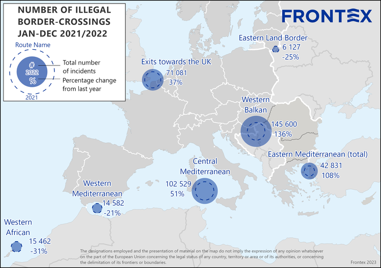 - 330 000 irregular border crossings detected in 2022, highest since 2016