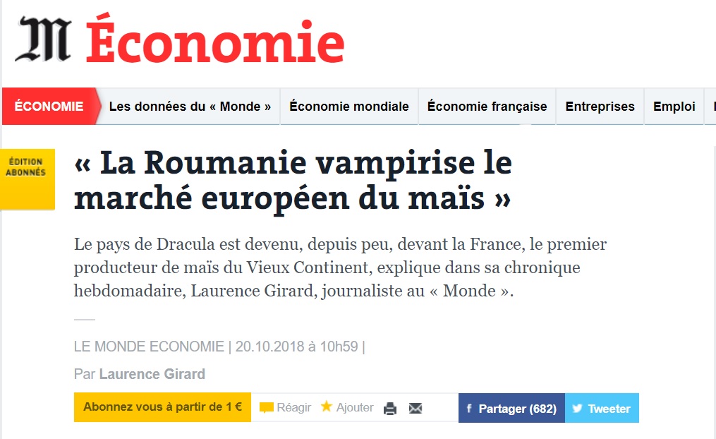 “Agricultorii francezi nu au reuşit să evite puterea românească. Ţara lui Dracula vampirizează piaţa europeană a porumbului sau, cel puţin, o domină…Nu este chiar o surpriză. Gurmanzii ştiu că, dacă polenta (terci din făina de porumb) este apanajul regiunii munţilor Apenini, acest fel de mâncare gustoasă poartă numele de mămăligă în Carpaţi. Dar investitorii din România nu se gândesc doar la apetitul compatrioţilor lor. Profitul mare din cerealele galbene este rezultat din export”, scrie Le Monde.