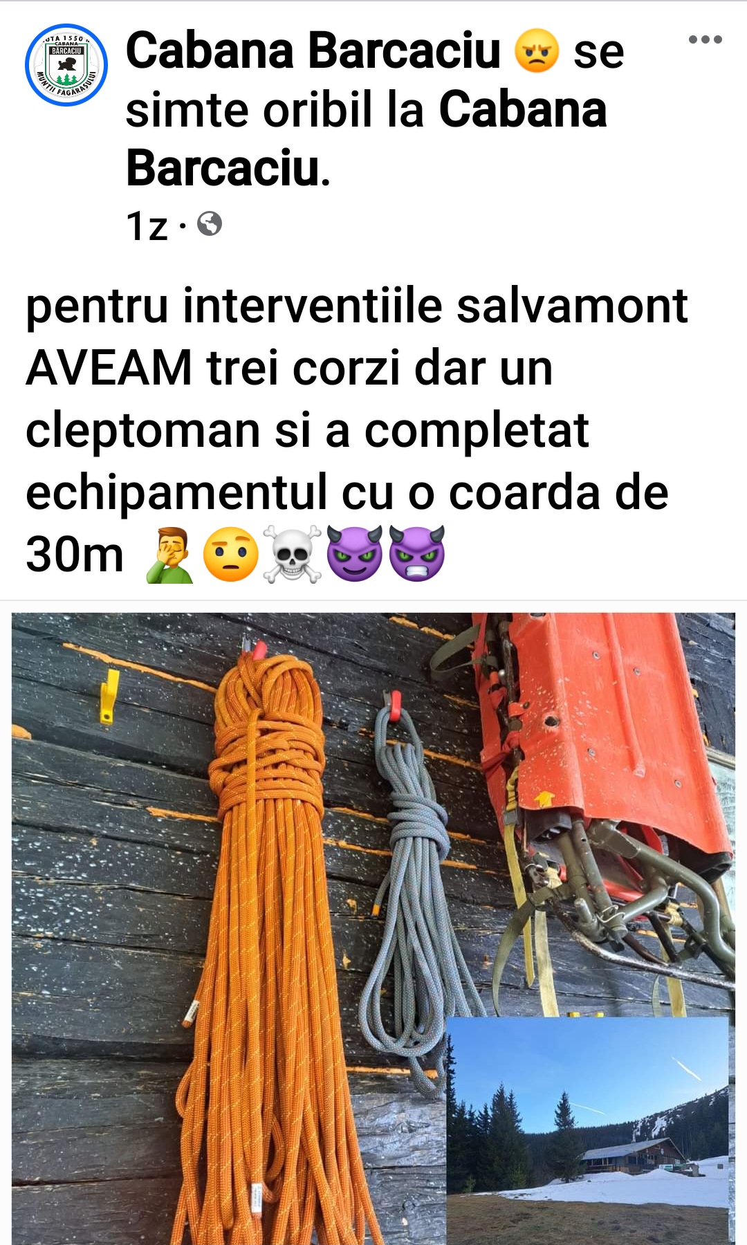 Un incident neplăcut a avut loc în această mini-vacanță la Cabana Bărcaciu. Se pare că unul dintre turiștii de acolo a plecat cu o coardă de 30 de metri destinată intervențiilor Salvamont Sibiu. Proprietarii cabanei au postat un mesaj pe pagina de facebook prin care își arată nemulțumirea, scrie publicaţia Turnul Sfatului.