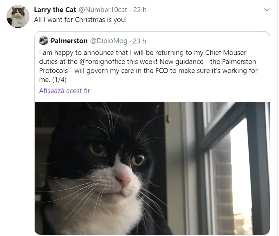 PS : Motanul Larry, Chief Mouser in Downing Street 10 (resedinta primului britanic) a postat si el pe Twitter un mesaj :