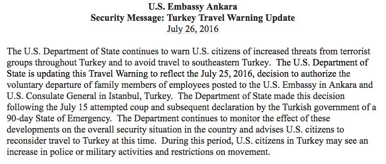 Ambasada SUA la Ankara a transmis si ea un avertisment pentru situatia din Turcia :