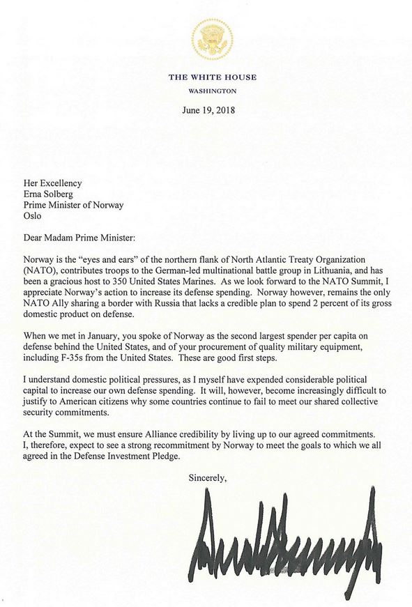 Iata, in premiera in Romania, scrisoarea trimisa de Trump premierului Norvegiei :