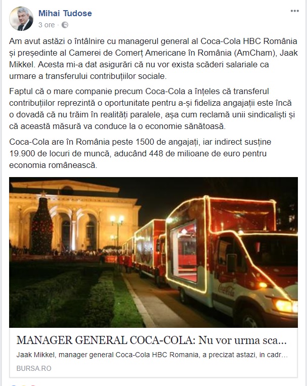 Articole Less than 1 min.Read Premierul Tudose e pe Coca Cola By Radu Tudor November 13, 2017 FacebookTwitterPinterestLinkedin Hot this week Articole Papa Leon : “Lumea este devastată de o mână de tirani” April 17, 2026 0 Papa Leon al XIV-lea a îndemnat joi la reconciliere... Articole Războiul florilor de cireș April 17, 2026 0 În Coreea de Sud, ca și în Japonia, începutul... Articole Grupul Bilderberg, dialoguri discrete la Washington April 17, 2026 0 Cea de-a 72-a reuniune a grupului Bilderberg, conferinţa politică... Articole Cât e datoria externă a României? April 17, 2026 0 Datoria externă pe termen lung a însumat 182,519 miliarde... Articole Foste mine de cărbune, devenite paradis turistic în Germania April 17, 2026 0 Un proiect de zeci de ani de transformare a... Topics Articole Papa Leon : “Lumea este devastată de o mână de tirani” 0 Papa Leon al XIV-lea a îndemnat joi la reconciliere... Articole Războiul florilor de cireș 0 În Coreea de Sud, ca și în Japonia, începutul... Articole Grupul Bilderberg, dialoguri discrete la Washington 0 Cea de-a 72-a reuniune a grupului Bilderberg, conferinţa politică... Articole Cât e datoria externă a României? 0 Datoria externă pe termen lung a însumat 182,519 miliarde... Articole Foste mine de cărbune, devenite paradis turistic în Germania 0 Un proiect de zeci de ani de transformare a... Articole Câte de valoros e aurul? 0 Aurul a avut una dintre cele mai abrupte corecții... Articole Un control făcut la timp! Cum a fost depistată boala oncologică într-un stadiu tratabil 0 Un control făcut la timp! Cum a fost depistată... Articole Primul Ambasador al lui Trump în România : Orbán a servit drept cel mai eficient avocat al Moscovei în cadrul instituțiilor occidentale 0 Votul Ungariei transmite un mesaj clar: democrația contează în... Related Articles Papa Leon : “Lumea este devastată de o mână de tirani” Articole April 17, 2026 Războiul florilor de cireș Articole April 17, 2026 Grupul Bilderberg, dialoguri discrete la Washington Articole April 17, 2026 Cât e datoria externă a României? Articole April 17, 2026 Foste mine de cărbune, devenite paradis turistic în Germania Articole April 17, 2026 Popular Categories ArticoleOpinionTripadvisor Articolul precedentOrange face marele anunt despre revolutia fiscala a PSDArticolul următorDecizie istorica la Bruxelles. Romania e parte