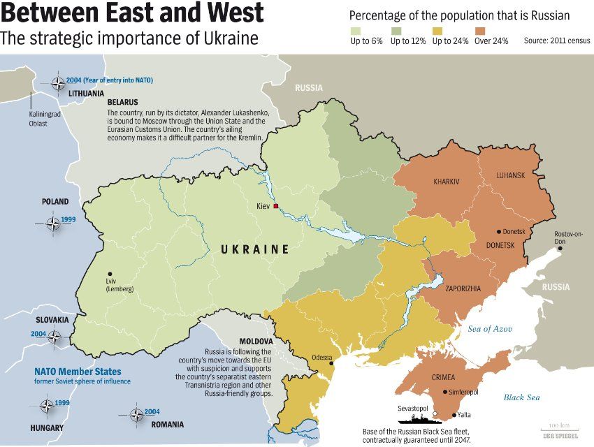 În articol şi în interviu, Putin recapitulează detaliat ideile sale favorite: nu există un popor independent ucrainean, fiindcă acesta este totuna cu poporul rus; statul ucrainean este o construcţie artificială, o întâmplare istorică şi ar trebui să mulţumească Rusiei că îi tolerează existenţa. Potrivit lui Putin, alungarea de la putere a fostului preşedinte ucrainean Viktor Ianukovici (pro-rus), în februarie 2014, a fost punctul culminant al unui plan occidental vechi de decenii de înfiinţare în Ucraina a ceva ce Putin numeşte “anti-Rusia”, din dorinţa de a menţine Rusia în şah. Din 2014, Ucraina nu mai este suverană, ci se află sub “administraţie străină” – un nume de cod pentru SUA şi vasalii lor din UE. Putin a avertizat că Moscova nu va tolera această stare de fapt. Şi există de asemenea milioane de ucraineni cărora nu le place situaţia şi cărora le este dor de îmbrăţişarea fraţilor lor ruşi.
