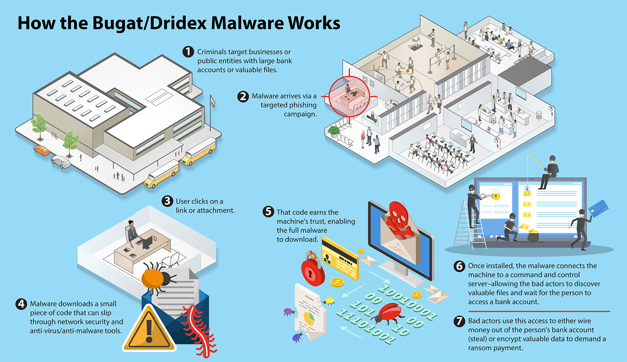 Grupul, cu baza la Moscova, este acuzat de faptul că a răspândit două programe de tip malware – ”Bugat” şi apoi ”Dridex” – în fişiere ataşate ale unor e-mailuri care infectau computerele victimelor cu scopul de a le fura datele de identificare şi coordonatele bancare.