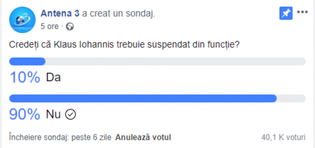 Articole Less than 1 min.Read Sondaj Antena 3 : 90% Iohannis nu trebuie suspendat By Radu Tudor July 16, 2018 FacebookTwitterPinterestLinkedin Sondaj efectuat pe pagina de Facebook Antena 3 Hot this week Articole Papa Leon : “Lumea este devastată de o mână de tirani” April 17, 2026 0 Papa Leon al XIV-lea a îndemnat joi la reconciliere... Articole Războiul florilor de cireș April 17, 2026 0 În Coreea de Sud, ca și în Japonia, începutul... Articole Grupul Bilderberg, dialoguri discrete la Washington April 17, 2026 0 Cea de-a 72-a reuniune a grupului Bilderberg, conferinţa politică... Articole Cât e datoria externă a României? April 17, 2026 0 Datoria externă pe termen lung a însumat 182,519 miliarde... Articole Foste mine de cărbune, devenite paradis turistic în Germania April 17, 2026 0 Un proiect de zeci de ani de transformare a... Topics Articole Papa Leon : “Lumea este devastată de o mână de tirani” 0 Papa Leon al XIV-lea a îndemnat joi la reconciliere... Articole Războiul florilor de cireș 0 În Coreea de Sud, ca și în Japonia, începutul... Articole Grupul Bilderberg, dialoguri discrete la Washington 0 Cea de-a 72-a reuniune a grupului Bilderberg, conferinţa politică... Articole Cât e datoria externă a României? 0 Datoria externă pe termen lung a însumat 182,519 miliarde... Articole Foste mine de cărbune, devenite paradis turistic în Germania 0 Un proiect de zeci de ani de transformare a... Articole Câte de valoros e aurul? 0 Aurul a avut una dintre cele mai abrupte corecții... Articole Un control făcut la timp! Cum a fost depistată boala oncologică într-un stadiu tratabil 0 Un control făcut la timp! Cum a fost depistată... Articole Primul Ambasador al lui Trump în România : Orbán a servit drept cel mai eficient avocat al Moscovei în cadrul instituțiilor occidentale 0 Votul Ungariei transmite un mesaj clar: democrația contează în... Related Articles Papa Leon : “Lumea este devastată de o mână de tirani” Articole April 17, 2026 Războiul florilor de cireș Articole April 17, 2026 Grupul Bilderberg, dialoguri discrete la Washington Articole April 17, 2026 Cât e datoria externă a României? Articole April 17, 2026 Foste mine de cărbune, devenite paradis turistic în Germania Articole April 17, 2026 Popular Categories ArticoleOpinionTripadvisor Articolul precedentIn sfarsit, o veste foarte buna de la TAROM !Articolul următorMoment dificil pentru apararea Romaniei