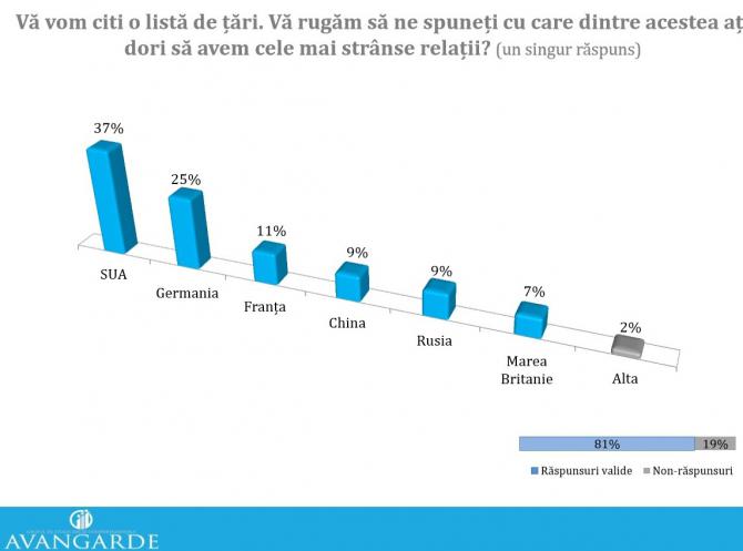 37% dintre cei intervievați consideră că România ar trebui să aibă o relație mai apropiată cu SUA, 25% cu Germania, 11% cu Franța, 9% cu China și tot 9% cu Rusia.