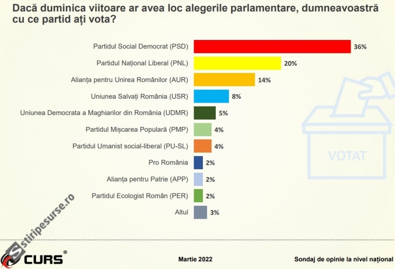 Un sondaj de opinie realizat de CURS, la nivel național, în perioada 2-11 martie 2022, indică faptul că dacă duminica viitoare ar avea loc alegerile parlamentare, românii ar vota cu: