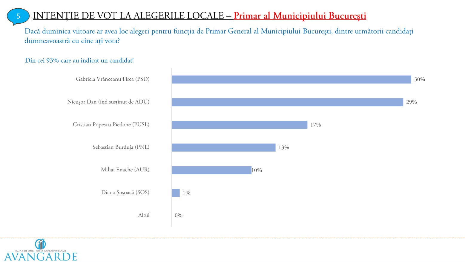 Potrivit sondajului Avangarde, candidatul comun susținut de PSD și PNL la sectorul 1, George Tuță, ar obține 34%, Clotilde Armand (USR) 32%, Liviu Negoiță (PUSL) 15%, Ramona Ioana Bruynseels (AUR) 12%, Daniel Tudorache (independent) 4%. Sondajul Avangarde a fost realizat în perioada 7 – 11 mai, prin metoda face-to-face, pe 1150 de subiecți cu o marjă de eroare de 2, 9%.