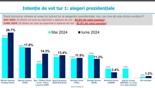 Actualul Secretar General Adjunct al NATO Mircea Geoană se situează pe primul loc în intenţiile de vot pentru alegerile prezidenţiale, cu o cotă de 26,7%, fiind urmat de preşedintele PSD, premierul Marcel Ciolacu – 17,8%, de liderul USR Elena Lasconi, de liderul SOS România Diana Şoşoacă, liderul PNL Nicolae Ciucă – 11,9% şi de liderul AUR George Simion – 11,2%, conform unui sondaj realizat de INSCOP la comanda News.ro. Aproape trei sferturi dintre români spun că în mod cert vor merge la vot.