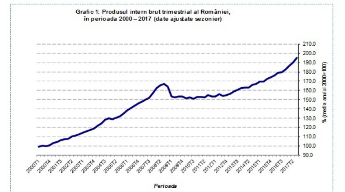 Astfel, potrivit INS, raportat la perioada similară din 2016, în T1 2017 creşterea PIB, ajustată sezonier, a fost de 5,8%, în T2 de 6,1%, iar în T3 de 8,6%.