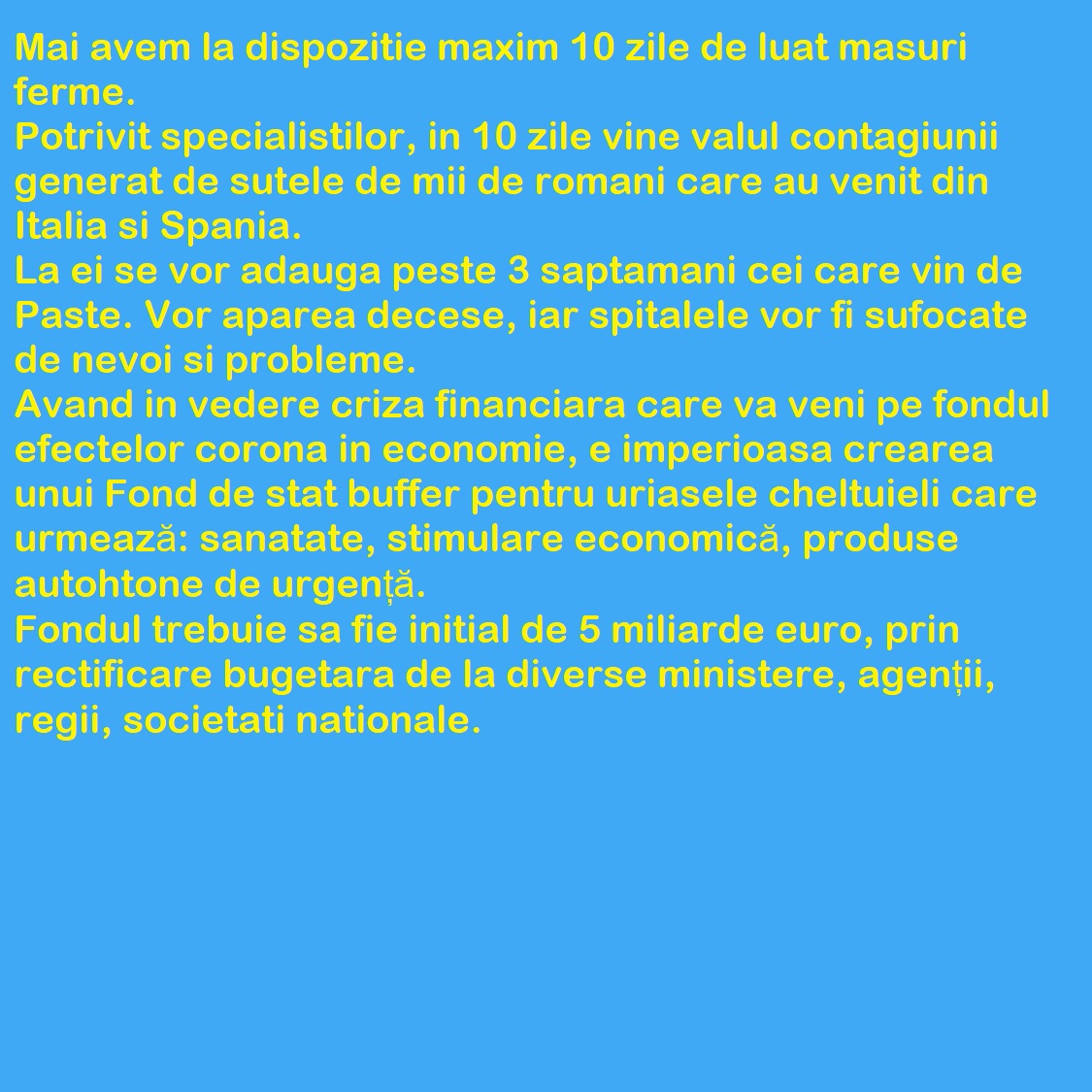 Articole Less than 1 min.Read #Urgenta, #Coronavirus : Guvernul trebuie sa creeze un Fond buffer de 5 miliarde euro By Radu Tudor March 20, 2020 FacebookTwitterPinterestLinkedin Incepand de azi, voi face publice 10 propuneri pe care le consider cruciale ca #Romania sa treaca mai usor prin criza generata de #coronavirus. Propunerea 1 Hot this week Articole Papa Leon : “Lumea este devastată de o mână de tirani” April 17, 2026 0 Papa Leon al XIV-lea a îndemnat joi la reconciliere... Articole Războiul florilor de cireș April 17, 2026 0 În Coreea de Sud, ca și în Japonia, începutul... Articole Grupul Bilderberg, dialoguri discrete la Washington April 17, 2026 0 Cea de-a 72-a reuniune a grupului Bilderberg, conferinţa politică... Articole Cât e datoria externă a României? April 17, 2026 0 Datoria externă pe termen lung a însumat 182,519 miliarde... Articole Foste mine de cărbune, devenite paradis turistic în Germania April 17, 2026 0 Un proiect de zeci de ani de transformare a... Topics Articole Papa Leon : “Lumea este devastată de o mână de tirani” 0 Papa Leon al XIV-lea a îndemnat joi la reconciliere... Articole Războiul florilor de cireș 0 În Coreea de Sud, ca și în Japonia, începutul... Articole Grupul Bilderberg, dialoguri discrete la Washington 0 Cea de-a 72-a reuniune a grupului Bilderberg, conferinţa politică... Articole Cât e datoria externă a României? 0 Datoria externă pe termen lung a însumat 182,519 miliarde... Articole Foste mine de cărbune, devenite paradis turistic în Germania 0 Un proiect de zeci de ani de transformare a... Articole Câte de valoros e aurul? 0 Aurul a avut una dintre cele mai abrupte corecții... Articole Un control făcut la timp! Cum a fost depistată boala oncologică într-un stadiu tratabil 0 Un control făcut la timp! Cum a fost depistată... Articole Primul Ambasador al lui Trump în România : Orbán a servit drept cel mai eficient avocat al Moscovei în cadrul instituțiilor occidentale 0 Votul Ungariei transmite un mesaj clar: democrația contează în... Related Articles Papa Leon : “Lumea este devastată de o mână de tirani” Articole April 17, 2026 Războiul florilor de cireș Articole April 17, 2026 Grupul Bilderberg, dialoguri discrete la Washington Articole April 17, 2026 Cât e datoria externă a României? Articole April 17, 2026 Foste mine de cărbune, devenite paradis turistic în Germania Articole April 17, 2026 Popular Categories ArticoleOpinionTripadvisor Articolul precedent“Nu avem ventilatoare. Moartea va veni pentru mulți. Mai avem maxim o săptămână pentru luarea unor decizii salvatoare”Articolul următorAnunt de ultima ora facut de dr Adrian Streinu-Cercel